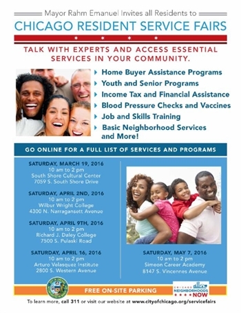 These free Resident Service Fairs will begin on Saturday, March 19th and run over the next two months in different locations throughout Chicago. These will be one-stop workshops where residents can speak with experts from different city agencies to learn more about the many services that are already available, as well as new initiatives that we are launching. These include everything from basic neighborhood services like recycling and garbage collection to programs offering tax guidance, financial advice, job and skills training, and much more. Information will also be available on new City initiatives like our new Homebuyer Assistance program, which helps homebuyers access financial assistance for their down payment and closing costs on a new home.