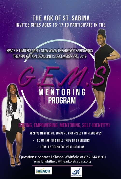 The Ark for St. Sabina GEMS Mentoring Program is inviting girls 13-17 to join us. Hurry, the deadline is December 3rd and space is limited. Join a great group of young ladies as we: