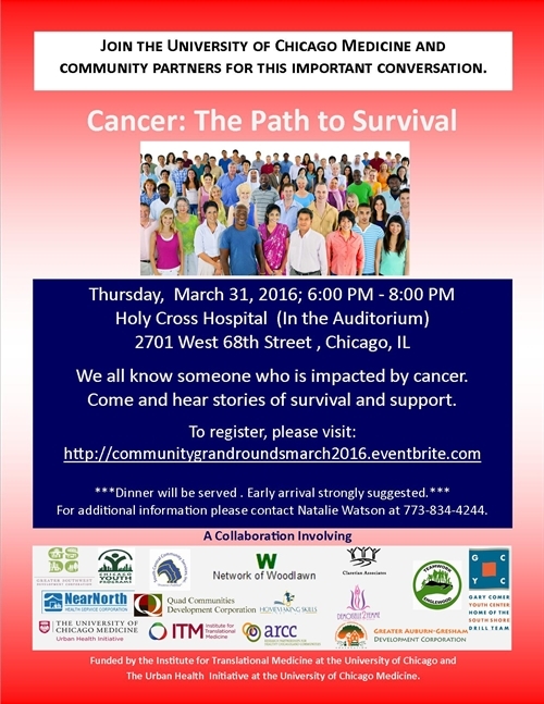 There're still open slots! Join the University of Chicago Medicine and Community Partners for this important conversation around those impacted by cancer and survived! March 31st, Holy Cross Hospital, 2701 W. 68th Street, 6-8pm, Dinner will be served! Please RSVP.