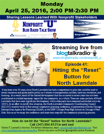 In an effort to rectify this situation, the North Lawndale Community Coordinating Council (NLCCC) recently held its first annual community planning conference, in partnership with the Chicago Metropolitan Agency for Planning (CMAP), at the DRW College Prep High School on Chicago’s West Side. Rodney Brown and Dennis Deer will be guests on the Nonprofit “U” radio blog talk show on Monday, April 25 from 2:00 p.m. to 2:30 p.m. Nonprofit "U" is an online forum where nonprofit stakeholders can discuss the latest developments in the sector and increase their capacity to serve their clients and build sustainable communities. Valerie F. Leonard, an expert in community and organizational development is the host. The show will stream live from BlogTalkRadio.com/nonprofit_u. The archived podcast will be available on BlogTalkRadio, Valeriefleonard.com/NonprofitU, iTunes and Stitcher.