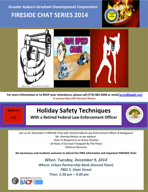 Join us for a community FIRESIDE CHAT with a retired federal law enforcement officer and bodyguard. December 9th, 2:30-4:30pm, 7801 S. State Street, Urban Partnership Bank Community Room. We will explore how to respond to key scenarios, including how to respond to an active shooter and 10 rules of survival if stopped by the police. All Businesses and Residents are encouraged to attend this timely FREE, informative and important FIRESIDE CHAT. For more information and to RSVP your attendance call 773.483.3696.