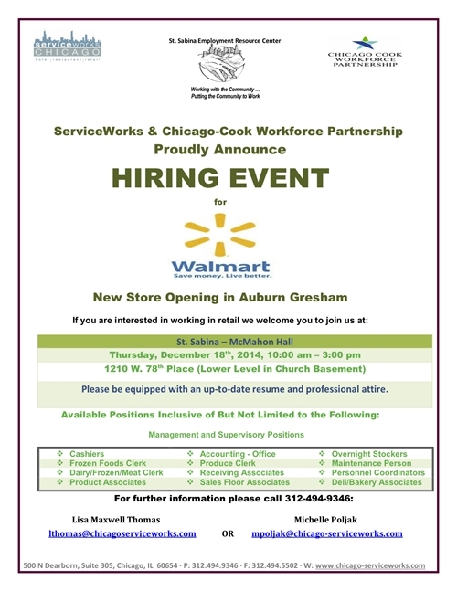 Walmart Hiring Event for New Store Opening in Auburn Gresham. For more information for this event, sponsored by ServiceWorks & Chicago-Cook Workforce Partnership. Please feel free to share contact information on attached flyer. To download just click here.