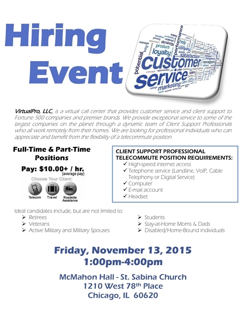 11/13/15, is a Hiring Event for VirtualPro, LLC, a virtual call center that provides customer service and client support to Fortune 500 companies and premier brands. The event is from 1pm - 4pm, 1210 West 78th Place, McMahon Hall. They are looking for professional individuals who can benefit from a flexible position. Full and Part