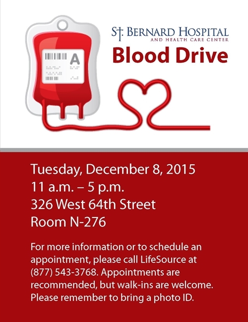 St. Bernard Hospital will host a blood drive on Tuesday, December 8, 2015. To schedule an appointment, please contact LifeSource at 877-543-3768 or visit https://donateblood.lifesource.org/AppointmentScheduling.aspx and enter the group code Q603.