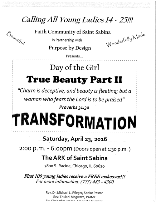The ARK of Saint Sabina is hosting a Day of the Girl, "True Beauty Part II workshop, Saturday, April 23, 2016, 2:00pm - 6:00pm (Doors open at 1:30pm), 7800 S. Racine. The first 100 young ladies receive a FREE makeover!!! For more information call 773.483.4300. Sponsored in partnership with Purpose by Design.