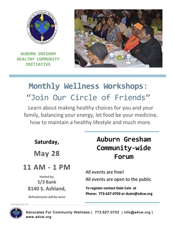 Join Advocates for Community Health as they gather a circle of friends to learn about healthly choices or you and your familiy, May 29th, 11am - 1pm, at Fifth Third Bank, 8140 S. Ashland. RSVP Dale Cain 773.627.0703.