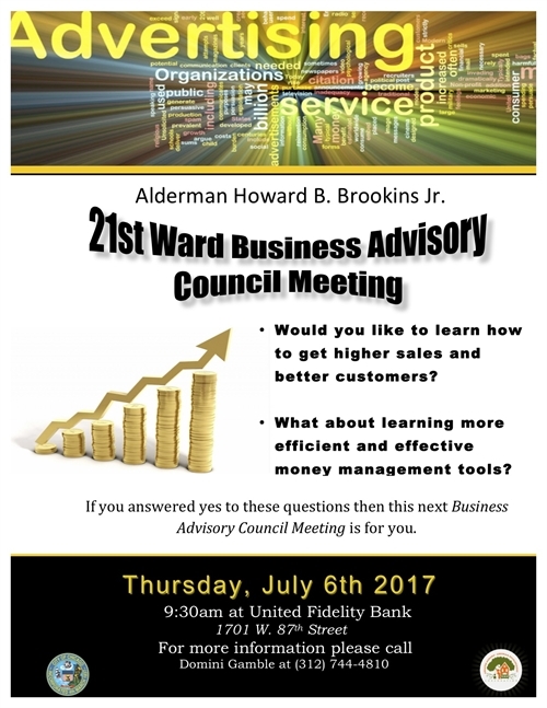 Calling all businesses in the 21st Ward business district and local entrepreneurs, looking to improve customer service and learn about more effective money management tools! Attend the 21st Ward business advisory meeting. Call Domini Gamble for more information at 312.744.4810.