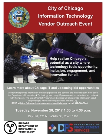 The Department of Innovation Technology and the Department of Procurement Services invites all IT vendors that are interested in opportunities with the City to the upcoming Information Technology Vendor Outreach Event on November 28, 2017. Please see the attached flyer for more information.