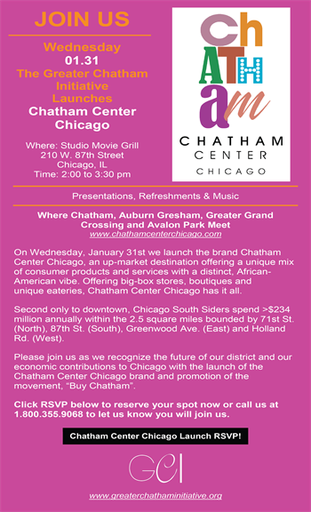 Please Join us on January 31, 2018 at the Studio Movie Grill, 210 W. 87th Street, for the Launch of Chatham Center Chicago!