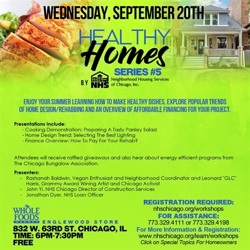 Healthy Homes By NHS Chicago in partnership with the Whole Foods Englewood store, it is a free 6 part series created by the Englewood coordinator, it focuses on the idea of holistically creating healthy homes and includes the notion of healthy eating, sustainable rehabbing trends and introduction to financing home improvements. The goal is to expand the vision of a healthy home by showing homeowners how they can build equity in their home sustainable by rehabbing it themselves.  The Healthy Homes series will conclude with a big finale on October 18, 2018.