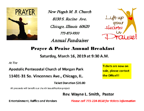 Please join New Pisgah Missionary Baptist Church for its Annual Fundraiser. It is a Prayer and & Praise Annual Breakfast, on Saturday, March 16, 2019 at 9:30am. Tickets are now on sale. Please contact the New Pisgah office, at 773.224.8650, for ticket information. Come lift up yoour heart in praise. It is a community event. All faiths are welcome.