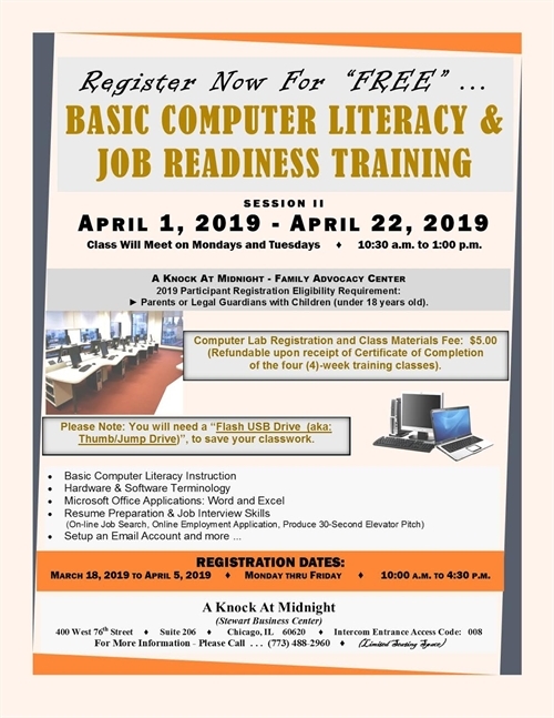 Register for free for Basic Computer Literacy & Job Readiness Training session II starts April 1st - April 22nd. Classes are held at A Knock At Midnight (AKAM) Family Advocacy Center.