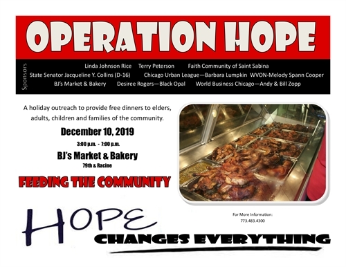 Operation Hope is a local holiday outreach tradition to provide free dinners to elders, adults, children and families of the Greater Auburn Gresham community and open to the public across the City of Chicago. Event will be December 10, 2019 at BJ's Market and Bakery, 79th & Racine location, from 3:00-7:00pm.