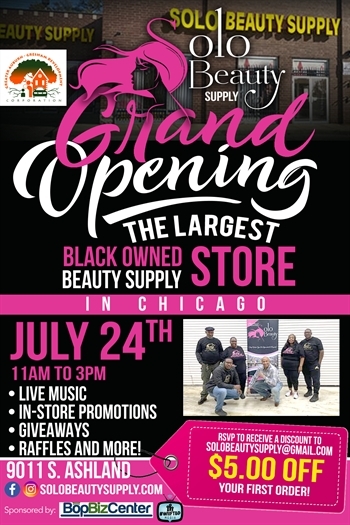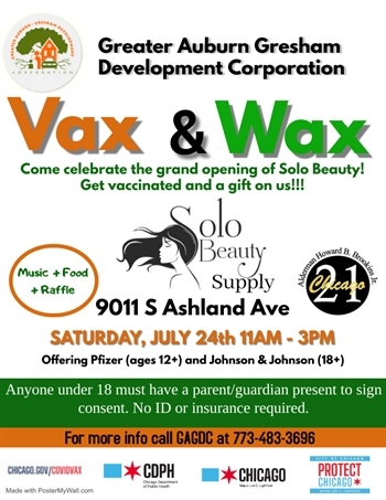Come join us for the grand opening of Solo Beauty Supply on 9011 S Ashland. Also, GAGDC and 21st Ward Alderman Howard B. Brookins will also celebrate this Grand Opening with one of our Vaccination Series event, Vax and Wax. Get your vaccination and a gift on us. July 24th 2021 from 11am - 3pm.
