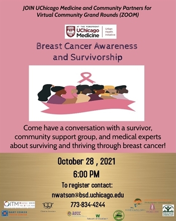 On Thursday, October 28th , Join UChicago Medicine & Community Partners for a Virtual Community Grand Rounds about breast cancer and survivorship! Come have a conversation with a survivor, community support group and medical expert about surviving and thriving through breast cancer! Click the link below to register.