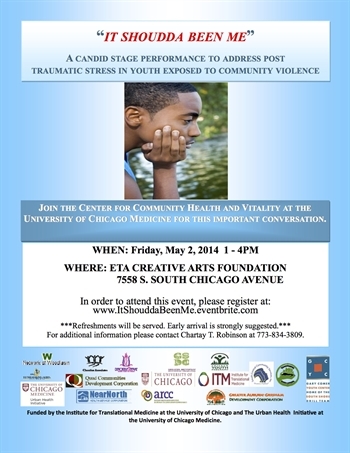 Featuring, "It Shoudda Been Me," a candid staage performance addresses post traumatic stress in youth exposed to community violence. Join the Center for Community Health and Vitality at the University of Chicago Medicine for this important conversation.Friday, May 2, 2014, from 1:00-4:00pm at ETA Creative Arts Foundation, 7558 S. South Chicago Avenue.