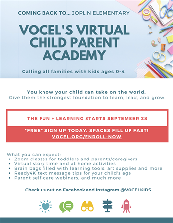 Vocel has a few slots remaining for families and caretakers in the Gresham area with children 0-4 years old. VOCEL provides a 2 generational early learning accelerator based on science to support both the child and parent. Joplin is one of our 20 School Partners.