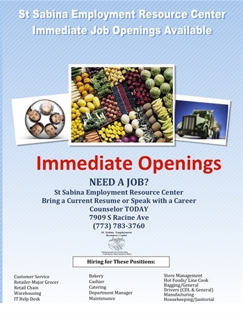 Need a Job? St. Sabina Employment Resource Center is assisting with hiring for many positions with immediate job openings! Bring a current resume or speak to a Career Counselor TODAY at 7909 S. Racine Ave. or call 773-783-3760 for an appointment.