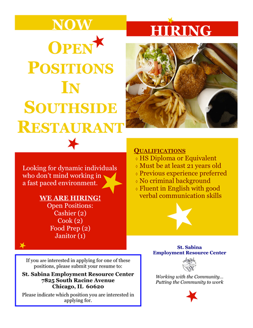 Open positions in * Southside Restaurant *Looking for dyanamic indivuduals who don't mind working in a fast paced environment. Hiring for cashiers, cooks, food preps and janitors. If you or someone you know is interested in applying, contact the St. Sabina Employment Resource Center, 7825 South Racine.