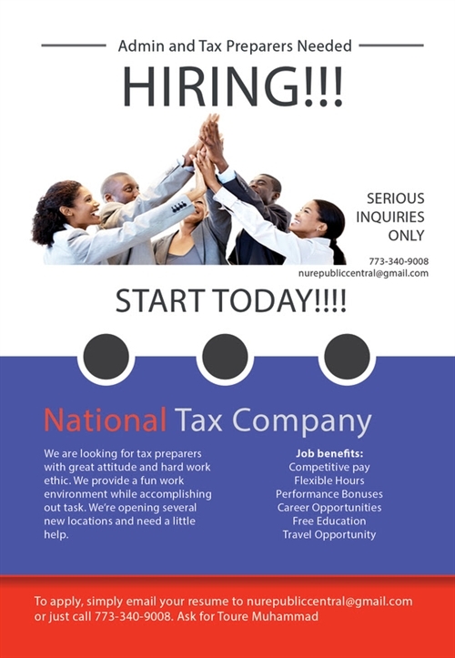 National Tax Company is looking for tax preparers wtih a great attitude and hard work ethic. We provide a fun work environment while accomplishing our task. We are opening several new locationsa and need a little help. Call 773-340-9008.