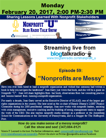 Joan Garry, Principal of Joan Garry Consulting, will be a guest on the Nonprofit “U” radio blog talk show on Monday, February 20, 2017, from 2:00 p.m. to 2:30 p.m. Nonprofit "U" is an online forum where nonprofit stakeholders can discuss the latest developments in the sector and increase their capacity to serve their clients and build sustainable communities. Valerie F. Leonard, an expert in community and organizational development, is the host. The show will stream live from BlogTalkRadio.com/nonprofit_u. Archived episodes may be found at BlogTalkRadio.com, Valeriefleonard.com/NonprofitU, iTunes, Podcast Chart, Blubrry and Stitcher.