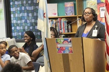Westcott Elementary principal Monique Dockery introduces Chance the Rapper.