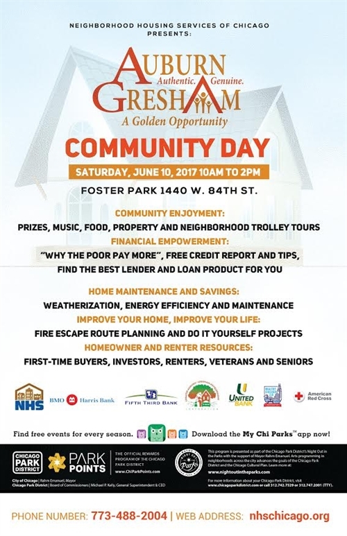 Auburn Gresham Community Day, is Saturday, June 10, 2017, at Foster Park. This community event day is hosted by Neighborhood Housing Services of Chicago (NHS) and its many community sponsors and neighorhood organizations. The NHS organization is driven by the belief that home ownership is essential to strengthening households and communities.