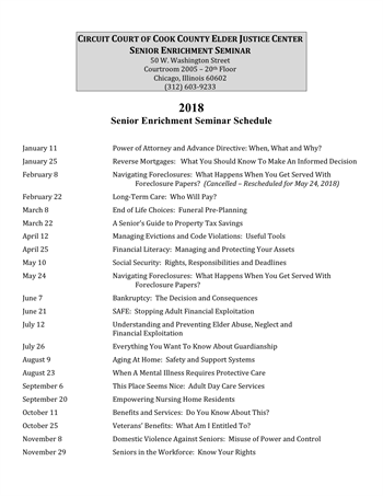 Please mark your calendar for the upcoming seminar dates.  It is not too late to reserve your seat at the next Senior Enrichment Seminar.   Please call the Elder Justice Center at (312) 603-9233 today.    I look forward to seeing you again at the next seminar.