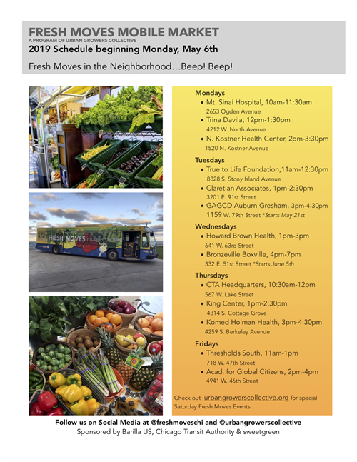 Fresh Moves Mobile Market is coming back to Auburn Gresham, every Tuesday afternoon, beginning, May 21, 2019, 3:00p - 4:30p. Come make a commitment to eat and buy locally grown fruits and vegetables.