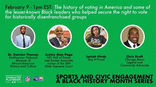 In celebration of Black History Month, the NFL, United Way Worldwide and EVERFI want to dig more deeply into the role of sports as a vehicle for change through civic engagement in a three-part Character Playbook LIVE event series across February that examines the past, present and future of voting and civic engagement in America. Each event will focus on key topics including: