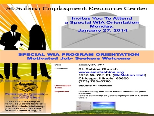Please come to a special WIA (Workforce Investment Act) Program Orientation, MONDAY, JANUARY 27TH, St. Sabina Church 1210 W. 78th Street, at BEGINS AT 10:00a.m. It takes work to land work, Motivated Job-Seekers Welcome!