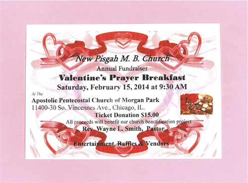 Please join New Pisgah M.B. Church, for it's annual fundraiser, Valentine's Prayer, Breakfast, Saturday, February 15th, at 9:30AM, At the Apostolic Pentecostal Church of Morgan Park, located at 11400-30 Vincennes Ave.