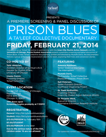 IMAN and the University of Chicago, Muslim Students Association are partnering with the Ta'leef Collective to present Prison Blues, a new documentary from Mustafa Davis, this Friday, February 21 @ 7 PM, Mandel Hal at 1131 E. 57th St., University of Chicago, Reynolds Club. A panel discussion, including IMAN Executive Director, Rami Nashashibi, and leaders, Rafi Peterson, Dr. Rolanda West and sister Amina Mathews, will follow the documentary presentation.