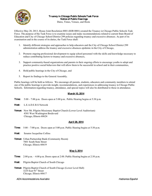 "Truancy in Chicago Public Schools Task Force" meeting in Auburn Gresham, May 3rd, Pilgrim Baptist Church of South Chicago (Lower Level Hall), 3235 East 91st Street, 2:00pm to 4:00pm, doors open at 2pm, Public Hearing begins at 2:30pm.
