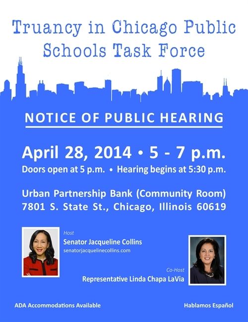 Truancy in Chicago Public Schools Task Force notice of public hearing, on April 28, 2014, Urban Partnership Bank - Community Room, 7801 S. State Street 2nd Floor, from 5:00pm - 7:00pm.