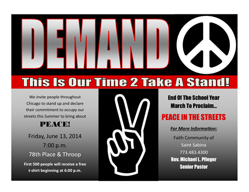 End of the the school year march to demand PEACE IN THE STREETS. We invite people throughout Chicago to stand up and declare their commitment to occupy our streets this Summer to bring about PEACE. Join us Friday, June 13, 2014, 7:00pm at 78th Place & Throop. First 500 people will receive a free t-shirt begining at 6:00pm.