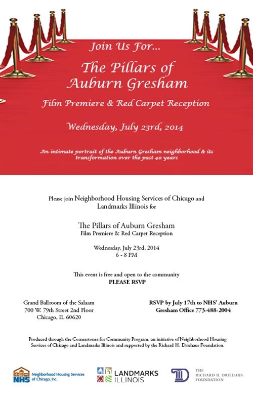 Please join Neighborhood Housing Services of Chicago and Landmarks Illinois for a premeier showing the film "The Pillars of Auburn Gresham." The event will be held on Wednesday, July 23, 2014, from 6:00pm to 8:00pm, at 700 W. 79th, in the Grand Ballroom of the Salaam Restaurant, 2nd Floor. This event is free and open to the community. We ask that you PLEASE RSVP by July 17th, NHS Auburn Gresham Office 773-488-2004.