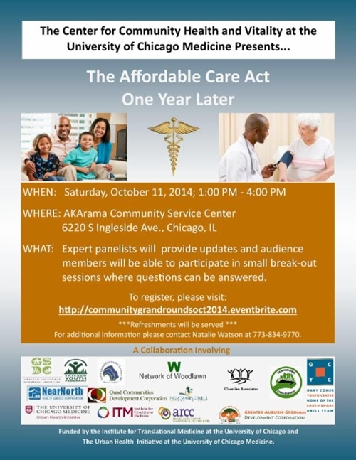 The Center for Community Health and Vitality and the University of Chicago Medicine presents, "The AThe Affordable Care Act, One Year Later." Saturday, October 11, 2014 from 1:00-4:00pm, at the AKArana Community Service Center, 6220 S. Ingleside Ave.