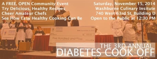 The 3rd Annual Diabetes Cook Off! A FREE, OPEN Community Event, Try Delicious, Healthy Recipes, Cheer Amateur Chefs, See How Easy Healthy Cooking Can Be. Saturday, November 15, 2014, Washburne Culinary Institute, 740 W. 63rd St., Building U, Open to the Public at 12:30am.