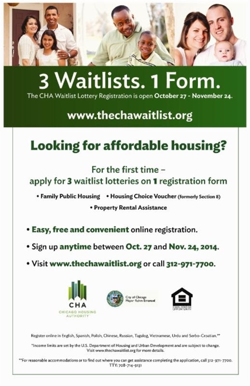Looking for affordable housing? The CHA (Chicago Housing Authority) Waitlis Lottery Registration is open until November 24th. Easy Free an convenient online registration.