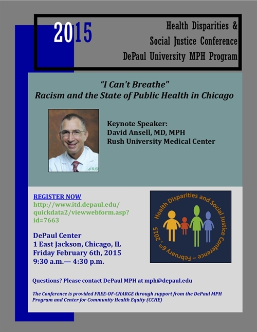 HEALTH DISPARITIES & SOCIAL JUSTICE CONFERENCE 2015, Friday February 6th, 2015 @ DePaul University’s DePaul Center, Keynote Address: “I Can't Breathe" Racism and the State of Public Health in Chicago, Keynote Speaker: David Ansell, MD, MPH, Rush University Medical Center