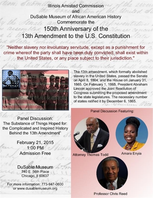 Celebrate the 150th Year of the 13th Amendment with the Illinois Amistad Commission and the DuSable Museum of African American History on Saturday, February 21, 2015 at 740 East 56th Place, 1:00 pm. Please call 773.947.0600 for more information.