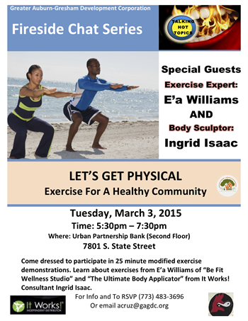 Join us for the March 2015 Fireside Community Chat is March 3, 5:30pm, 7801 S. State Street, Community Room. At March's chat we're getting a little physical! Come ready to learn and practice new exercise techniques and find out about body sculpting that works! RSVP 773-483-3696 so we can plan enough refreshments. All residents, businesses and organizations are welcome. See you there!