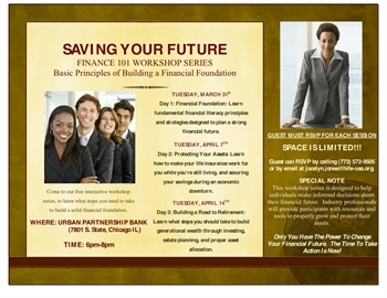 SAVING YOUR FUTURE, a Finance 101 Workshop Series to learn the basic principles of building a financial foundation. Urban Partnership Bank, 7801 S. State, 6-8pm, March 31st, April 7th, and April 14th.