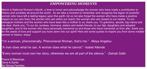 March is National Women's Month, a time to honor and acknowledge the women who have made a contribution to history and societies all around the world. As we take a moment to remember and recognize the legion of powerful women who have left a lasting legacy upon this earth, let us not also forget the women who have made a positive impact on our lives; the women who are within our reach; the women who are closet to our hearts. To our biological mothers and the women who have been like a mother to us, thank you. To grandma, abuela, big mama and ma dear, thank you. To our tia, auntees, hermana, sisters and sistah-friends; to our hija, daughters and adopted daughters, and to the women who have personally mentored us and those who have mentored us from afar, thank you for the seeds of love and support you have sewn into our spirit! Here are some quotes to inspire you from some notable women in history- enjoy!