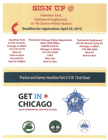 Sign up at Hamilton Park, 513 W. 72nd Street, 60621 Monday-Friday, 10am-9pm, Saturday and Sunday, 9am-5pm. or at Teamwork Englewood, 815 W. 63rd Street, Monday-Friday 9am-4pm or 7th District Chicago Police Dept. CAPS Office, 1438 W. 63rd Street, Monday-Saturday 9am-7pm.