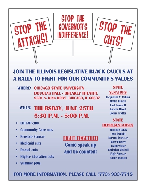 Senator Jacqueline Collins and the Illinois Legislative Black Caucus Need Your Help. Join them on, Thursday, July 25, 2015, at Chicago State University, 9501 South King Drive Chicago, Illinois, 5:30 pm to 8:00 pm.