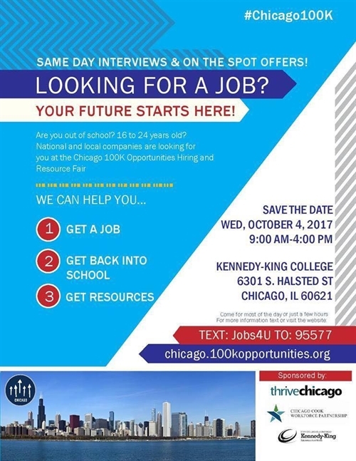 Jobs and Resource Fair for young adults age 16 to 24 on Wednesday, October 4th from 9am to 4pm at Kennedy King College. #Chicago100K